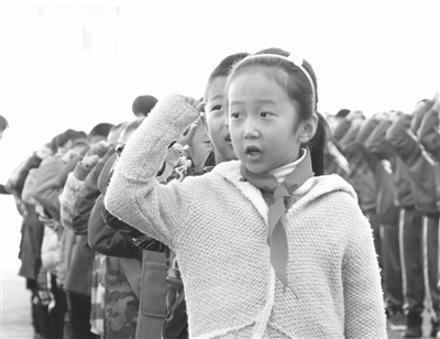 金秋十月,为庆祝中国少年先锋队建队69周年,10月11日,洮北区明仁小学举办了少先队建队日活动。活动中,六年级同学为一年级新队员授红领巾,新队员在星星火炬旗下宣誓。此次活动勉励少年儿童热爱祖国,热爱人民,努力成长为有知识、有道德、有作为的新一代建设者。图为新队员在星星火炬旗下宣誓。