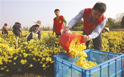11月13日,洪桥镇党员在与村民一起采摘帝皇菊。