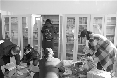 为切实做好文化精准扶贫工作及丰富广大农民群众的文化生活,充分发挥公共图书馆在脱贫攻坚战中的作用,11月9日,通榆县图书馆流动图书车来到双岗镇长青村、向海乡西艾力村开展“脱贫攻坚”送书下乡活动。此次送书下乡为长青村增补图书800册、为西艾力村增补图书1600册。送书下乡提升了村民的文化获得感,丰富了村民的精神文化生活,为文化精准扶贫助力。图为图书馆工作人员在农家书屋对新书进行上架整理。