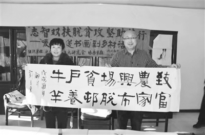 刘巷东二话没说,提笔写道“致富农家兴市场,脱贫村户养牛羊”。穆玲丽拍手叫好。不一会儿,穆玲丽字画就拿到了手,笑得合不拢嘴地说:“我可来着了,书法、绘画都有了,尽管还想要,但还是把机会留给别人吧。”