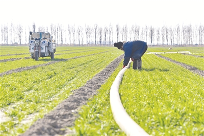 11月22日,河北省滦州市茨榆坨镇李塔坨村农民在麦田内浇灌封冻水。