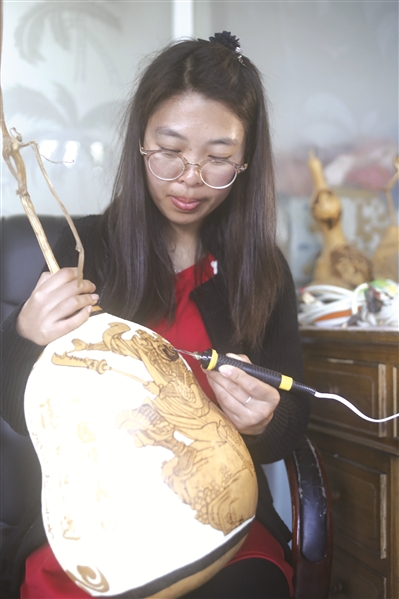 李桂荣老师还根据杨巍的喜欢和自身实际情况,开始传授葫芦烙画技术。为了让她一只左手能烙出画来,残疾人创意大院的师傅们为她制作葫芦夹子,教她葫芦绘画和葫芦烙画。为了尽快把技术学到手,她吃住在残疾人创意大院,贪黑起早用心学技艺,在短短几个月就烙出了精美的作品,备受人们青睐。杨巍制作的葫芦工艺品,人们纷纷购买,纯收入2000元左右,她实现了人生价值和梦想。