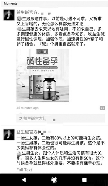 那时白晓青刚怀孕,看到“碱孕宝”的广告后很愤怒,但之后又觉得挺荒谬的。“这是赤裸裸的对女性的歧视。这个东西到底是什么玩意儿,怎么能确保生男孩呢?”白晓青说。