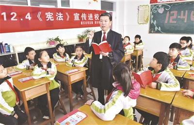 12月3日,在石家庄新乐市民生街小学,一名律师在给学生讲解宪法知识。