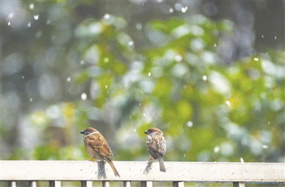 12月11日,安徽省六安市迎来降雪天气,两只麻雀在雪中的栏杆上停留。