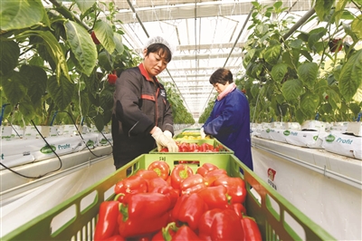 12月18日,在南和县贾宋镇一家现代农业示范园区,工人在整理采摘的彩椒。