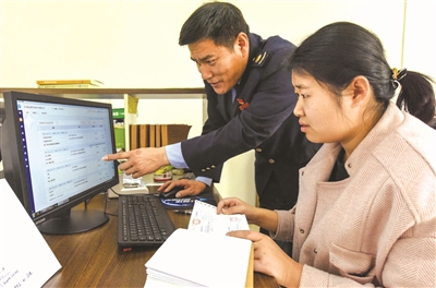 1月19日,文安县税务局的工作人员在指导一家企业的工作人员网上申办业务。