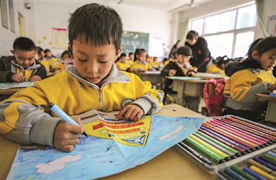 2月21日,河北省大厂回族自治县城区二小一年级四班的孩子们在绘制家乡美景。