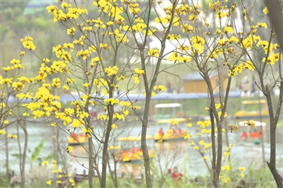 近日,广西南宁江南公园种植的黄花风铃木迎春绽放,漂亮的黄色花朵吸引游客前来赏花观景。 新华社发(喻湘泉摄)