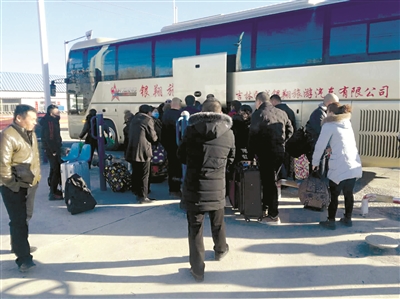 加强劳动力域外转移就业是促进就业的重要措施。2019年新春伊始,洮北区就业服务局借开展“春风行动”契机,先期组织46名农村劳动力赴浙江劳务输出基地就业。图为大巴车接送劳务输出人员。 刘金占 范秀莲摄