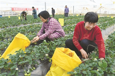3月5日,莱西市沽河街道办事处董家山后村村民于淑芳(右一)在当地一家有机农业生态园大棚里为草莓地除草。该生态园租用70多户农民的土地,并招聘村民到公司上班。