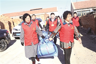 通榆县“爱心志愿者团队”成立5年了,人员由刚成立时的5人发展到现在的100余人,足迹踏遍全县的乡镇村屯,举行公益活动150多次,为弱势群体募集善款28万余元。仅团队的组织者肖峰个人捐款就达4万余元。图为前不久爱心志愿者团队志愿者为贫困家庭送去棉被等物品。 本报记者张殿文摄