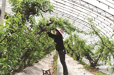 3月19日,在稷山县清河镇荆庄村的稷山县爱民桃树种植基地内,工作人员在管护油桃树。