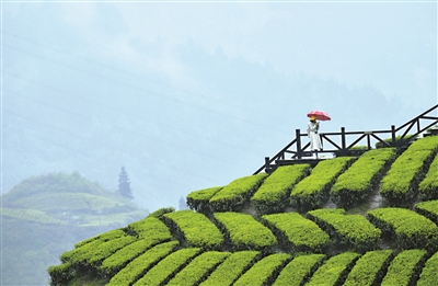 4月15日,游人冒雨在湖北省恩施土家族苗族自治州宣恩县伍家台村的有机茶园漫步,欣赏苍翠欲滴的茶园风景。 新华社发(宋文摄)