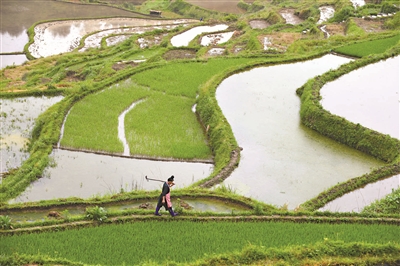 5月18日,农民从贵州省丹寨县龙泉镇高要梯田里走过。