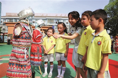 5月28日,老师带领孩子们认识不同民族的服饰。