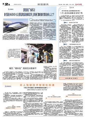 我国时速600公里高速磁浮试验样车5月23日在青岛下线。这标志着我国在高速磁浮技术领域实现重大突破。高速磁浮列车可以填补航空与高铁客运之间的旅行速度空白,对于完善我国立体高速客运交通网具有重大的技术和经济意义。