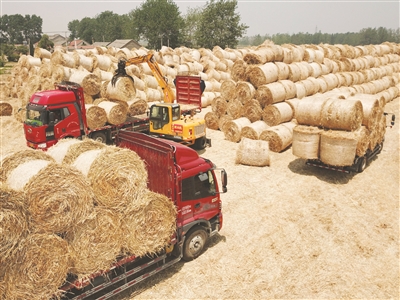 6月2日,在江苏省宿迁市泗洪县龙集镇,村民将秸秆进行打包堆放,待统一销售到生物质发电厂、奶牛养殖场和食用菌生产企业等地。 新华社发(许昌亮摄)