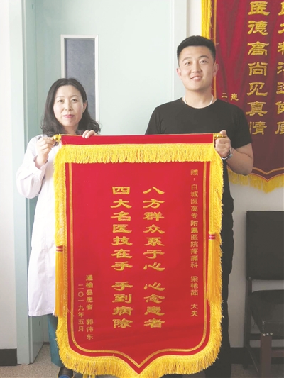 “感谢梁大夫为我解除病痛,更感谢她心系患者的为民情怀。”近日,通榆患者郭伟东将饱含着感谢之情的印有“八方群众系于心,心念患者;四大名医技在手,手到病除”的锦旗,送到白城医高专附属医院疼痛科梁艳茹大夫的手中。“梁大夫不仅用高超的医术治愈了折磨我好久的头疼病,还时时处处为患者着想,服务态度和蔼亲切,特别让人感动。令我深深感悟到医者仁心的可敬,也坚定我努力学习回报社会的信心,努力成为像梁大夫一样的好人。” “我只是做了该做的事情,我们医院的大夫都是这样对待患者的。”梁艳茹笑着说。