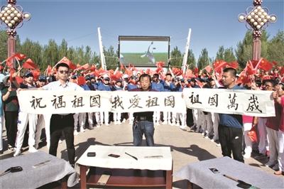 伴随着激情澎湃的旋律,来自县书法家协会的会员挥毫泼墨,用书法表达对祖国母亲的祝福。