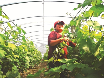 镇赉县镇赉镇南岗子村农民王永刚利用大棚种植葡萄,收效良好,1200平方米的大棚种植了光辉、腾引、紫翠香等6个葡萄品种,预计今年能采摘1500公斤,均价可达30元/公斤。 本报记者李晓明摄