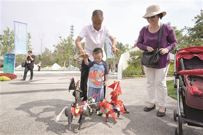 6月23日,来自河南省宝丰县的娄艳俊在“河南日”活动上帮助小朋友体验提线木偶。