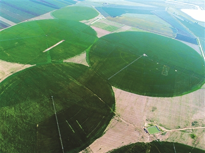 图为大型自走式指针喷灌设备在田间灌溉的场景。 邱会宁摄