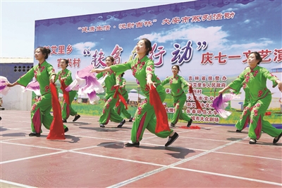 近日,“健康生活·悦动吉林”大安市系列活动——新艾里乡富兴村“扶贫在行动”庆七一文艺汇演在富兴村举行。接地气的二人转,行云流水的广场舞,欢快喜庆的歌曲等精彩节目依次上演,掌声和欢笑声更是一浪高过一浪。图为活动现场表演者欢快舞蹈。