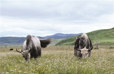 7月7日,在四川省阿坝藏族羌族自治州红原县的邛溪镇热坤村,两只牦牛在草原上吃草。