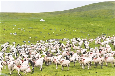 夏日,青海省海北藏族自治州祁连县的牧场满目绿色,羊群被群山环抱,美如画卷。