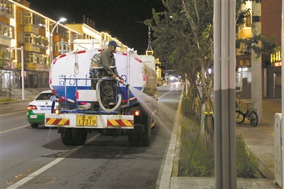 现在正值高温天气,市城管局园林处工作人员每天晚上7点至凌晨3点浇灌城区绿化带,给植物“解渴”。 本报记者王野村摄