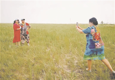 在如梦似幻的美景中,车队沿着蜿蜒的草原公路逶迤前行,又一片如诗图景映入眼帘:湛蓝的天空,碧绿的草原,银白色的芦苇荡,暗黄色的沙岗,大色块穿插交错,相接相融。天地间雄浑浩荡,古风犹存,大自然美景揉碎在浮藻间,沉淀在梦幻中……牛心套保是一首五彩的诗篇、一幅写意的丹青,是一颗镶嵌在水乡草原的明珠,一叶生灵的“诺亚方舟”,扑入他的怀里,或者,让我住进他的心里。默然、相爱、寂静、欢喜、不舍不弃。