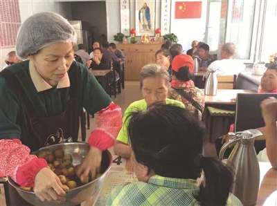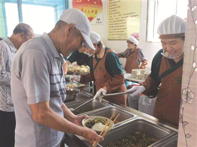 在午餐开始前,有位义工应老人们的邀请,为大家唱了一首歌曲《万爱千恩》。演唱者动人的歌声,将父母之恩、儿女深情唱得令人感动,许多老人情不自禁地应和,大家都沉浸在那种直抵心灵的歌声中。歌唱结束后,餐厅内响起了热烈的掌声。记者身旁的两位老人悄声说,每天饭前能欣赏到义工们唱的歌曲,心情一下子就好了许多。随后,老人们有序地排队打饭就餐。开餐时,记者看到有4个不锈钢盆,盆里分装着小白菜炒土豆片、豆角炖南瓜、青椒炒柿子等,另外还有小咸菜,主食是米饭和馒头。打饭时,有的老人行动不便,这时就会有义工前来帮忙。记者注意到,就餐后的碗中没有剩余的饭菜,特别干净,真是名副其实的光盘。值得一提的是,该餐厅厨房几乎不产生垃圾,洗碗、洗菜的水都会用来浇花、拖地或冲卫生间,从不浪费。记者数了一下,共有57人就餐,其中,有两位打扮时尚的年轻人也在此就餐。赵静表示,餐厅虽然为老年人就餐而设,但也希望更多的年轻人能来此体验,关爱老年人。
