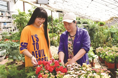 通榆县开通镇青年农民孙会军、胡凤丽夫妇投资近百万元,成立了凤丽美化植物种植专业合作社。他们引进上百种花草树木,成为远近闻名的养花致富带头人,并且安置30余名农村剩余劳动力就业,先后被白城市和通榆县评为返乡创业标兵和创业先锋。图为员工在大棚侍弄花卉。陈宝林摄