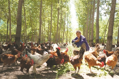9月4日,农民在巨鹿县阎疃镇王家庄村林下家禽养殖基地内喂食家禽。