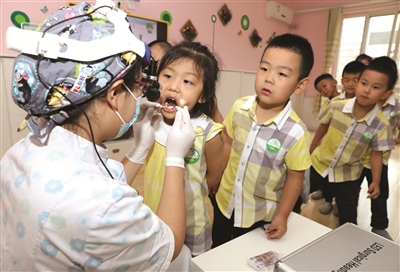 9月19日,医护人员在石家庄市第一幼儿园为小朋友检查口腔。