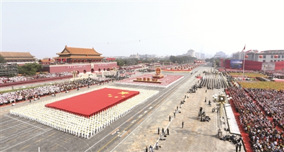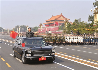 雄壮的军乐声中,习近平乘车沿着宽阔的长安街,依次检阅15个徒步方队、32个装备方队。近15000名受阅官兵整齐列阵、英姿勃发,580台受阅装备在阳光下熠熠生辉。这是中国特色社会主义进入新时代的首次国庆阅兵,也是共和国武装力量改革重塑后的首次整体亮相。