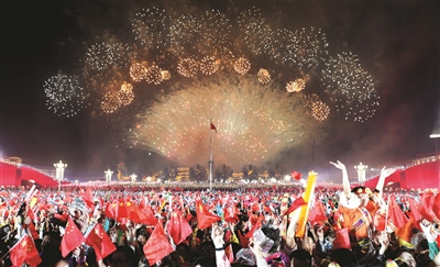 10月1日晚,天安门广场火树银花、流光溢彩。习近平等党和国家领导人来到天安门城楼,同各族各界群众联欢,共祝新中国70华诞。