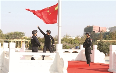 9时整,庆祝中华人民共和国成立70周年升国旗宣誓仪式正式开始。英姿飒爽的国旗护卫队迈着矫健的步伐,将鲜红的五星红旗护送到升旗台前。“起来!不愿做奴隶的人们……”伴随着国歌,鲜艳的五星红旗冉冉升起。参加仪式的全体人员面向国旗肃立行注目礼,目光随着国旗缓缓上移,鲜艳的五星红旗冉冉升起,迎风飘扬。