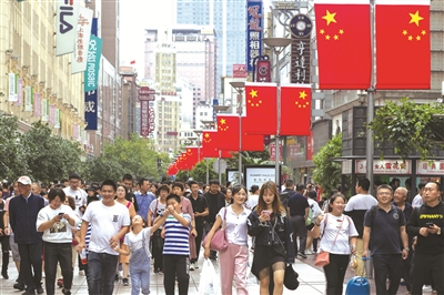 10月2日,市民游客在南京路步行街观光游览。