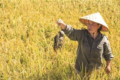 今年,洮南市福顺镇六家子村农民吴凤平采取生物酵素制肥喷洒,不仅让水稻健康生长,而且水中撒放鱼苗也成为绿色食品,既收获了有机稻米,又收获了稻田鱼。图为收鱼情景。 邱会宁摄