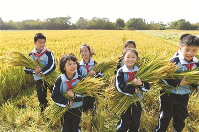 10月17日,吴兴区八里店镇常路学校的小学生在田间体验水稻收割。