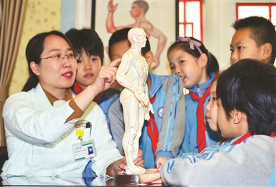 10月21日,在石家庄市桥西区振头社区卫生服务中心的国医堂,医务人员向小学生介绍人体穴位知识。
