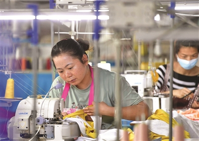 在广西柳州市融安县长安镇一乡村扶贫微车间,村民在服装生产线上作业(10月15日摄)。