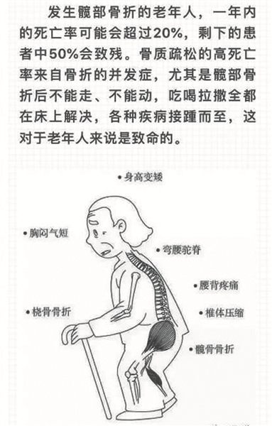 《提示》还建议:公众积极进行骨质疏松症1分钟自测,若判断为高危人群,应尽快去医院进行骨密度检测;定期检查骨密度是早发现和早诊断骨质疏松症的有效方法;骨质疏松症高危人群更应保持良好的生活方式,做到均衡饮食,适量运动,增加日光照射,必要时应遵医嘱进行药物干预;一旦确诊患有骨质疏松症,应在医生指导下进行规范化治疗,并进行必要的药物干预,同时保持良好的生活方式;运动有利于骨质疏松症的控制,但应视个人情况适当锻炼,避免运动损伤。同时,运动锻炼能降低因年老引起的肌肉僵硬,增强身体的柔韧性和平衡能力,从而防止跌倒等容易造成骨折的情况。