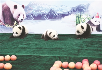 当日,2019年7、8月份新生的三只秦岭大熊猫幼崽在陕西省林业科学院秦岭大熊猫繁育研究中心亮相自己的“百日宴”,它们体重已经分别达到5200克、5120克和4898克,生长发育良好。它们的征名结果也于当日“官宣”。大熊猫楼生的宝宝名字为“秦酷儿”,大熊猫珠珠的龙凤胎宝宝名字分别为“佳佳”“园园”。 新华社记者李一博摄