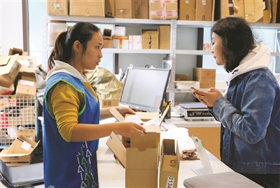 11月13日,驿站寄件员(左)使用回收纸盒帮顾客包装需要快递的物品。
