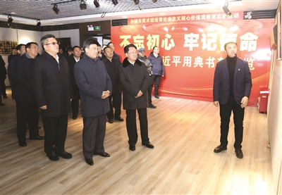 本报讯(记者薄秀芳)11月14日上午,正在我市调研的省人大常委会党组书记、常务副主任金振吉一行,在市委书记庞庆波、市长李明伟、市人大常委会主任葛树立陪同下,参观了“不忘初心、牢记使命——习近平用典书刻展览”。