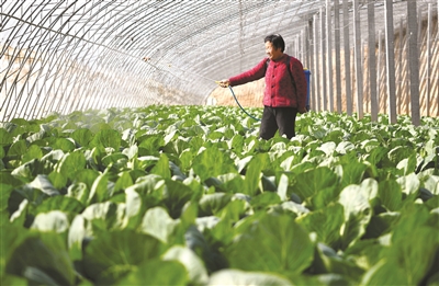 11月14日,菜农在廊坊市安次区北茨平村的一处蔬菜大棚内给甘蓝喷洒营养液。
