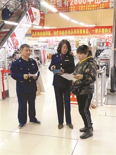 为提醒消费者防范保健食品类的虚假宣传,近日,洮南市市场监督管理局组织执法人员走进商场、超市,开展保健食品科普宣传活动。他们通过张贴防骗知识海报、发放知识手册等方式,向商超负责人、销售人员和消费者讲解保健食品基本知识和防骗注意事项及如何维护自身健康消费权益。图为工作人员发放宣传资料。 霍艳玲 李国祥 本报记者张殿文摄